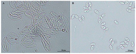 Purified fractions of fragmented oocysts of Eimeria tenella after Percoll gradient centrifugation. Purified sporulated oocyst walls (A), and sporocysts (B) visualized under Bright-field.