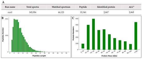 Statistics of root protein identification results: (A) Statistics of protein identification results (B) Peptides length distribution; (C) Proteins molecular weight distribution. All*: Total protein number that can be quantified for all samples.