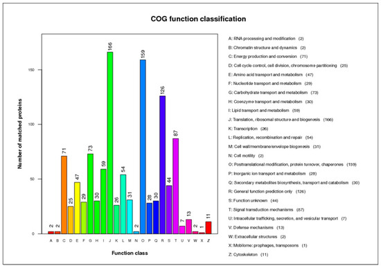 The 2865 proteins were analyzed with the COG, and approximately 36.7% were covered and classified into 25 categories (Figure 3). The three categories with the most identified proteins were translation, ribosomal structure, and biogenesis; posttranslational modification, protein turnover, and chaperones and signal transduction mechanisms.