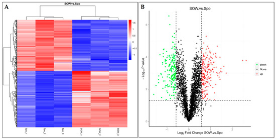 Hierarchical cluster analysis and volcano plot showing DEPs between SOW and Spo fractions. (A,B) SOW vs. Spo group.