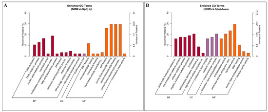 The hierarchical cluster analysis and volcano plots of DEPs between the SOW and Spo fractions are shown in Figure 3. A total of 401 DEPs, of which 211 were upregulated (FC ≥ 1.5, p ≤ 0.05) and 190 were downregulated (FC ≤ 0.67, p ≤ 0.05), were identified (Figure 4A,B) (Supplementary Table S2).