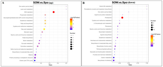 Scatterplot of the top 20 enriched KEGG pathways. Rich factor represents the ratio of the number of DEPs and the number of all protein in the pathways. KEGG pathway enrichment of up−regulated (A) and down−regulated (B) DEGs in SOW vs. Spo group.