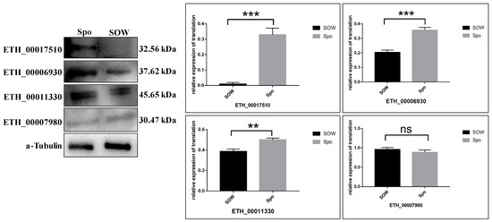 Verification of the protein expression by Western blot. Four proteins were randomly selected from laboratory protein antibodies for validation of Proteomics data. ETH_00017510, ETH_00006930, ETH_00011330, and ETH_00007980 represent the proteins heat shock protein, Microneme protein Etmic-2, SERPIN1 protein, and 14-3-3 protein. α-tubulin was used for reference protein. ** indicated a significant difference (p < 0.01), *** shown extremely significant difference (p < 0.001), ns was nonsignificant (p > 0.05).