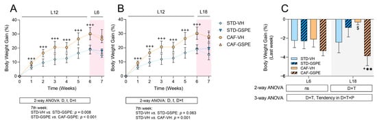 2.1. Abrupt Photoperiod Changes Altered Body Weight Gain, While Treatment with GSPE Partially Improved Serum Biochemical Parameters Affected by the CAF