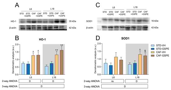 2.4. CAF Significantly Altered Both HO-1 and SOD1 Expressions after an Abrupt Change in Photoperiod, and GSPE could Modulate HO-1 Expression in a Photoperiod-Dependent Manner
