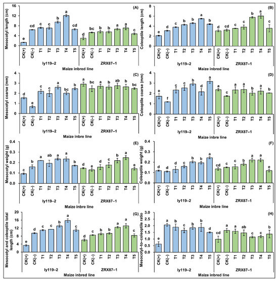 Maize growth phenotypes of mesocotyl and coleoptile under different treatments, including 3 cm seeding depth + 0 mg/L serotonin (5-HT) application (CK(+)), 20 cm seeding depth + 0 mg/L 5-HT application (CK(-)), 20 cm seeding depth + 1.0 mg/L 5-HT application (T1), 20 cm seeding depth + 1.5 mg/L 5-HT application (T2), 20 cm seeding depth + 2.0 mg/L 5-HT application [T3], 20 cm seeding depth + 2.5 mg/L 5-HT application (T4), and 20 cm seeding depth + 3.0 mg/L 5-HT application (T5). (A) Mesocotyl length. (B) Coleoptile length. (C) Mesocotyl coarse. (D) Coleoptile coarse. (E) Mesocotyl weight. (F) Coleoptile weight. (G) Mesocotyl and coleoptile total length. (H) Mesocotyl-to-coleoptile ratio. Different lowercase letters among treatments within single maize line indicate significant differences at p < 0.05.