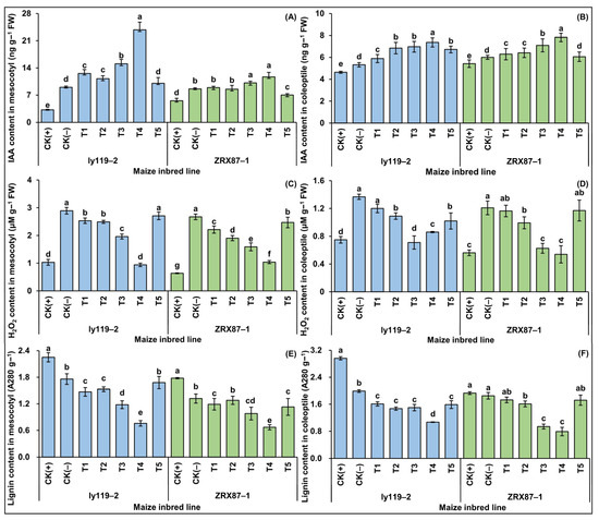 Physiological responses of maize mesocotyl and coleoptile under different treatments, including 3 cm seeding depth + 0 mg/L serotonin (5-HT) application (CK(+)), 20 cm seeding depth + 0 mg/L 5-HT application (CK(-)), 20 cm seeding depth + 1.0 mg/L 5-HT application (T1), 20 cm seeding depth + 1.5 mg/L 5-HT application (T2), 20 cm seeding depth + 2.0 mg/L 5-HT application (T3), 20 cm seeding depth + 2.5 mg/L 5-HT application (T4), and 20 cm seeding depth + 3.0 mg/L 5-HT application (T5). (A) Indole-3-acetic acid (IAA) in mesocotyl. (B) IAA in coleoptile. (C) Hydrogen peroxide (H2O2) in mesocotyl. (D) H2O2 in coleoptile. (E) Lignin content in mesocotyl. (F) Lignin content in coleoptile. Different lowercase letters among treatments within the mesocotyl or coleoptile of a single maize line indicate significant differences at p < 0.05.