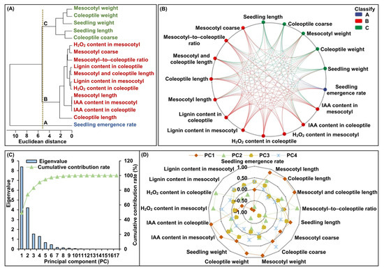 Framework of relations based on between-group linkage cluster analysis, Pearson pairwise correlation analysis, and principal component analysis (PCA) of 17 tested traits of two maize inbred lines treated with or without serotonin (5-HT) application at 20 cm and 3 cm seeding depths. (A) Between-group linkage cluster analysis was performed using R package (http://www.R-project.org/, accessed on 3 September 2023). (B) The Pearson correlation coefficient diagram among 17 tested traits was made with the Genescloud tool (https://www.genescloud.cn, accessed on 3 September 2023). Lines represent significant correlations (p < 0.05). (C) Eigenvalues and cumulative variance of principal components (PCs). (D) Eigenvector distributions of 17 tested traits in PC1, PC2, PC3, and PC4. H2O2: hydrogen peroxide; IAA: indole-3-acetic acid.
