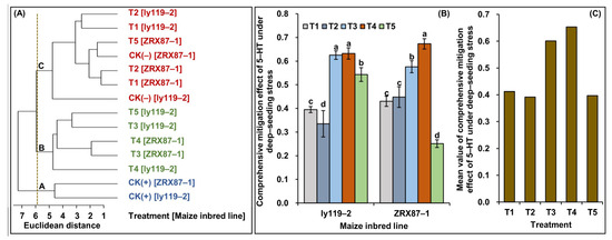 Comprehensive evaluations of deep-seeding tolerance or mitigation effect of serotonin (5-HT) on deep-seeding tolerance under different treatments in two maize inbred lines (ly119-2 and ZRX87-1). CK(+): 3 cm seeding depth + 0 mg/L 5-HT application; CK(-): 20 cm seeding depth + 0 mg/L 5-HT application; T1: 20 cm seeding depth + 1.0 mg/L 5-HT application; T2: 20 cm seeding depth + 1.5 mg/L 5-HT application; T3: 20 cm seeding depth + 2.0 mg/L 5-HT application; T4: 20 cm seeding depth + 2.5 mg/L 5-HT application; T5: 20 cm seeding depth + 3.0 mg/L 5-HT application. (A) Between-group linkage cluster analysis was performed using R package (http://www.R-project.org/, accessed on 3 September 2023). (B) The comprehensive mitigation effects of 5-HT on deep-seeding tolerance under different treatments in two inbred lines. Different lowercase letters among treatments within a single maize line indicate significant differences at p < 0.05. (C) Mean value of comprehensive mitigation effects of 5-HT on deep-seeding tolerance under different treatments in both maize materials.