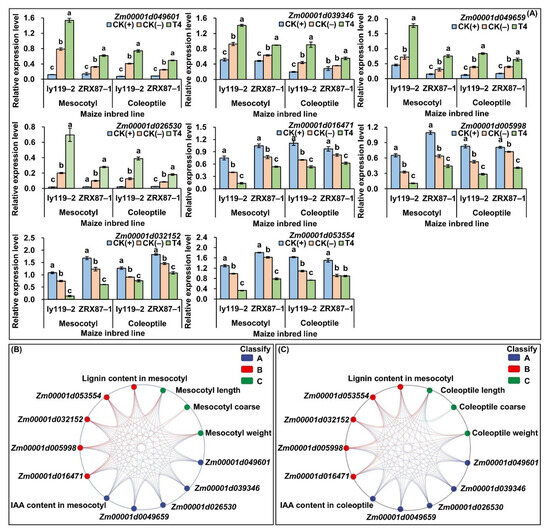 The relative expression patterns of eight candidate genes involved in indole-3-acetic acid (IAA) biosynthesis and signal transduction and lignin biosynthesis pathways, growth phenotypes, physiological responses (IAA and lignin contents), and their Pearson correlations in the mesocotyl and coleoptile of two maize inbred lines (ly119-2 and ZRX87-1) under 3 cm seeding depth + 0 mg/L serotonin (5-HT) application (CK(+)), 20 cm seeding depth + 0 mg/L 5-HT application (CK(-)), and 20 cm seeding depth + 2.5 mg/L 5-HT application (T4) treatments. (A) The relative expression levels of the eight candidate genes. Different lowercase letters among treatments within the mesocotyl of coleoptile of a single maize line indicate significant differences at p < 0.05. (B) The correlational relationships in the mesocotyl among growth phenotypes (mesocotyl length, coarse, and weight), physiological responses (IAA and lignin contents), and eight candidate genes were analyzed by the Genescloud tool (https://www.genescloud.cn, accessed on 13 October 2023). Lines represent significant correlations (p < 0.05). (C) The correlational relationships in the coleoptile among growth phenotypes (coleoptile length, coarse, and weight), physiological responses (IAA and lignin contents), and eight candidate genes were analyzed by the Genescloud tool (https://www.genescloud.cn, accessed on 13 October 2023). Lines represent significant correlations (p < 0.05).