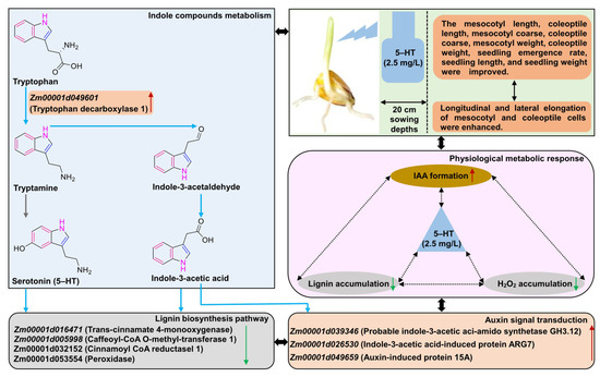 Molecular network underlying the cooperative elongation of mesocotyl and coleoptile in response to exogenous serotonin (5-HT) stimulation and deep-seeding stress. H2O2: hydrogen peroxide; IAA: indole-3-acetic acid. The blue arrow indicates that the path proceeds; the gray arrow indicates that the path is blocked; the red arrow indicates that the genes/metabolites are upregulated/accumulated; the green arrow indicates that the genes/metabolites are downregulated/accumulated.