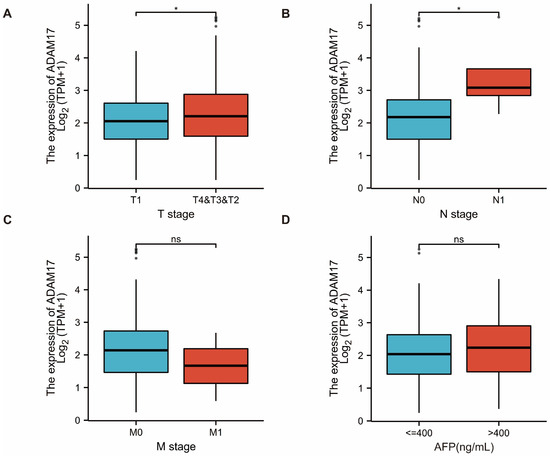 Correlation between ADAM17 levels and the HCC clinicopathological features. Increased ADAM17 expression correlates with more advanced T (A) and N (B), M stages (C), and a higher level of alpha-fetoprotein ((D), AFP). ns, no significance; * p < 0.05.