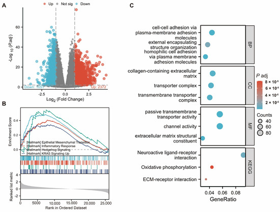 Differentially expressed genes (DEGs) and enrichment analyses. (A) Volcano plot showing the DEGs from the analysis by dividing patients into high and low ADAM17 expression groups (n = 424); (B,C) Gene Set Enrichment Analysis (GSEA), Gene Ontology (GO), and Kyoto Encyclopaedia of Genes and Genomes (KEGG) analysis showing the top functions or pathways enriched by the DEGs.