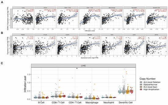 Analysis of immune cell infiltration based on the expression levels of ADAM17. (A,B) ADAM17 expression levels positively correlated with the infiltration of immune cells and the expression of immune checkpoints; (C) the boxplot demonstrates the impact that the ADAM17 copy number has on the immune cell infiltration level. * p < 0.05.