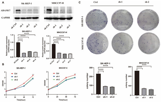 SK-HEP-1 and MHCC97-H cells were purchased from Shanghai Fuheng Biotechnology (Shanghai, China). The cells were cultured in Dulbecco’s modified eagle medium (DMEM; Gibco, Carlsbad, CA, USA) supplemented with 10% foetal bovine serum (FBS; Gibco). We knocked down the ADAM17 gene by treating liver cancer cell lines with short hairpin RNA (shRNA; Genepharma, Shanghai, China). Cells (1 × 105) were plated and incubated in a six-well plate for 24 h in DMEM supplemented with 10% FBS. Subsequently, cells were transfected with three lentiviral shRNA sequences and one lentiviral control sequence in medium supplemented with 10 μg/mL polybrene (Genepharma). After 16 h of cell transfection, the transfection medium was replaced with fresh medium. ADAM17 stable knockdown cells were achieved by puromycin (SK-HEP-1, 1 μg/mL, MHCC97-H, 2 μg/mL, Biosharp, Guangzhou, China) selection. Verification of knockdown efficiency needs to be performed via Western blotting.
