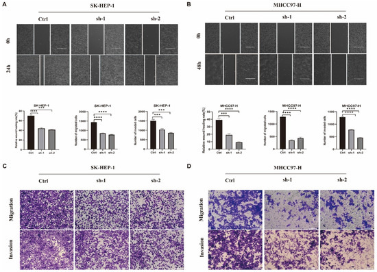 The roles of ADAM17 in promoting HCC cell metastasis. (A,B) Knockdown of ADAM17 significantly decreased the rates of scratch healing in SK-HEP-1 and MHCC97-H cell lines; (C,D) knockdown of ADAM17 inhibited cell migration and invasion in the indicated cell lines. *** p < 0.001; **** p < 0.0001.