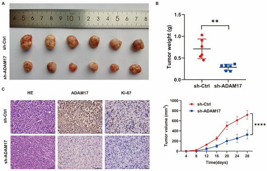 We explored the oncogenic effects of ADAM17 in a subcutaneously implanted tumour model. The results showed that ADAM17 knockdown significantly suppressed the increase in tumour volume and weight (Figure 10A,B). ADAM17 expression in the tumours was confirmed by immunohistochemistry (IHC; Figure 10C). Ki-67 staining revealed that ADAM17 knockdown decreased the proliferative ability of tumour cells (Figure 10C). Haematoxylin and eosin staining was performed on the collected tumour samples, and the results are presented in Figure 10C.