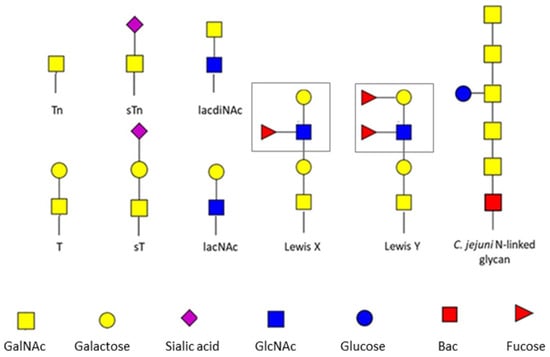 - van Sorge, N.M.; Bleumink, N.M.; van Vliet, S.J.; Saeland, E.; van der Pol, W.L.; van Kooyk, Y.; van Putten, J.P. N-glycosylated proteins and distinct lipooligosaccharide glycoforms of Campylobacter jejuni target the human C-type lectin receptor MGL. Cell Microbiol. 2009, 11, 1768–1781. [Google Scholar] [CrossRef]