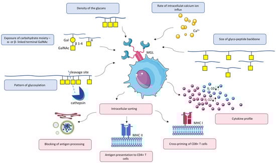 As a C-type lectin receptor, MGL exhibits endocytic activity and is able to internalize soluble Tn-bearing antigens whose intracellular route and further fate depend on their structure [14,17,37,38]. After endocytosis into DC, the recognized ligand dissociates from the coupled CLR receptor, under the appropriate endosomal environment. Following release, the receptor may be recycled back to the cell surface or degraded, whereas the antigen, depending on its properties, is further trafficked to different intracellular compartments [53]. In general, ingested ligands may be localized within endolysosomal compartments for MHC II presentation or targeted for loading onto MHC I complexes and cross-presentation via the vacuolar or endosome-to-cytosol route [53,54,55,56]. Napoletano et al. [57] found that the binding of tumor-associated mucin 1 (MUC1) peptides carrying a Tn antigen by MGL-expressed on immature monocyte-derived DCs leads to the internalization of recognized glyco-antigens, which may be further delivered into both MHC class I and II compartments. However, this intracellular sorting depends on the size of MUC1 glyco-peptides and its glycosylation pattern. The study showed that MGL-internalized 60 amino acid peptides (corresponding to the 3 tandem repeats of MUC1) are capable of being processed through the MHC class II and I pathways, which can result in glyco-antigen presentation to CD4+ T cells or the cross-priming of CD8+ T cells, respectively. Interestingly, an analysis of the interaction of MGL with the larger soluble glycoprotein of the recombinant MUC1, composed of 16 tandem repeats corresponding to those found in vivo in tumor tissues, showed that the glycoprotein enters the MHC II but does not reach the MHC I compartments. Although cancer-related MUC-1 is only available in full-length form in vivo, MUC-1-specific CD8+ T cells were found in patients with cancer [58,59]. However, this effect may be due to another sugar-independent mechanism of antigen uptake [60].