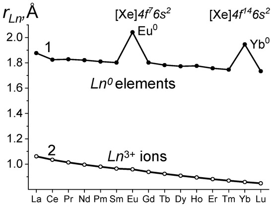 LC was first discovered in 1926 [11]. It has been studied for almost a hundred years. For elements (Ln0), LC is described as a monotonic decrease in the radii with deviations in Eu0 and Yb0 (curve 1 in Figure 1 (reference data)). They are associated with stable configurations of the electronic shells in Eu0 4f75d06s2 и Yb0 4f145d06s2.
