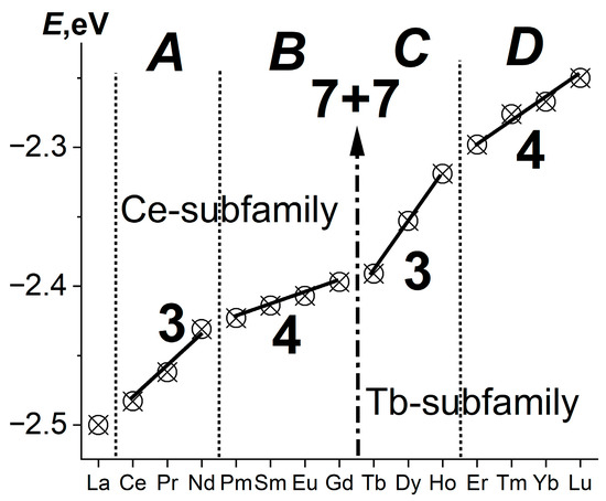 A similar division of the Ln series into four parts reveals a more fundamental property: the ionization potentials of atoms Ln0 → Ln3+ + 3e−. However, the authors [16] describe the dependence they obtain, similar to Figure 2, as “uniformly increasing”.
