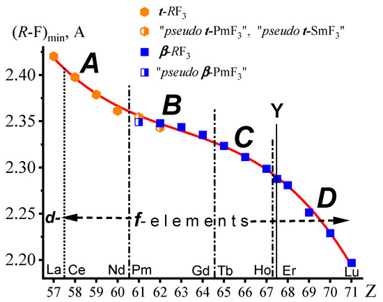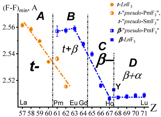 The dependence of (F-F)min on Z in the t-(R,Ln)F3 structures is shown in Figure 3 by orange closed hexagons for R = La-Nd and semi-open hexagons for “pseudo t-PmF3” and “pseudo t-SmF3”. This dependence is linear and demonstrates a decrease in (F-F)min, with an increase in Z from 57La to 62Sm. The dependence of (F-F)min on Z for β-LnF3 (Ln = Sm-Lu) is shown by blue closed squares and for “pseudo β-PmF3” by a half-opened blue square.