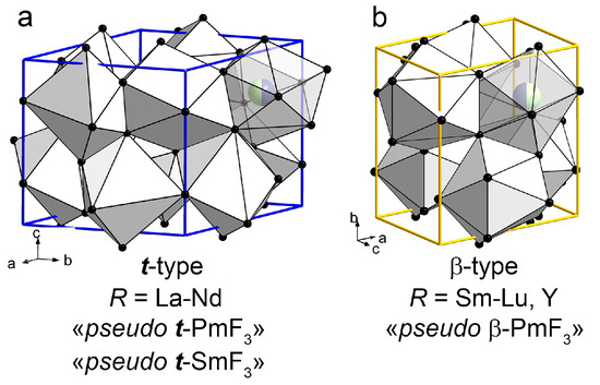 The t- and β-type structures are shown in Figure 6. RF3 crystals with R = La-Nd have a t-type structure (Figure 6a). PmF3 and SmF3 are dimorphic. The PmF3 model, “pseudo PmF3”, crystalize in both t- and β-structural types (Figure 6a,b). The model of t-SmF3, “pseudo t-SmF3” has a t-type structure (Figure 6a) and SmF3 can be obtained from melt in the β-form (Figure 6b). RF3 crystals with R = Sm-Nd have a β-type structure (Figure 6b).