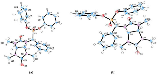 Compound 4a′ crystallizes in a monoclinic crystal system, space group C2/c. The asymmetric unit contains one 4a′ molecule and one and a half acetonitrile solvate molecules (Figure 1a). The unit cell contains eight formula units. The crystallographic space group is centrosymmetric; therefore, both enantiomeric forms of compound 4a′ crystallize as a true racemate. The configuration of the stereocenters (3a, 6a, CHPO3) in compound 4a′ is as follows: R,S,R (and enantiomeric S,R,S) (Figure 1).
