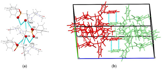 (a) Homochiral supramolecular chains of 4a″ molecules, viewed along the crystallographic direction (a–c); (b) packing diagram of 4a″, different enantiomers shown in red and green, with blue dashed lines indicating C–H···π stacking interactions.