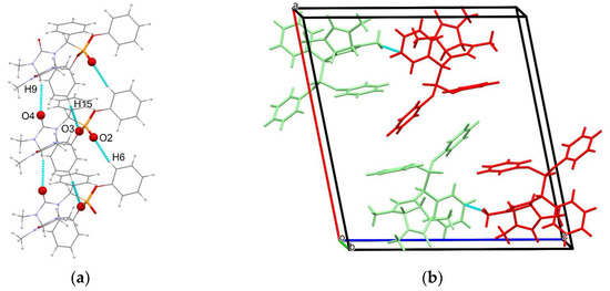 Similarly to compound 4a′, the enantiomers of 4a″ of the same configuration are joined into supramolecular chains oriented along the crystallographic axis b (Figure 3a), but the short CH···O contacts of the phosphonate groups involve only the hydrogen atoms of the phenyl rings (d(O2–H6) = 2.53 Å and d(O3–H15) = 2.65 Å). The carbonyl oxygen atoms form only one type of short CH···O contacts with the hydrogen atoms of the glycoluril fragment (d(O4–H9) = 2.65 Å). In the crystal packing, the enantiomers of 4a″ are joined only by C–H···π (d(C19–H25C) = 2.76 Å) contacts, and no other specific supramolecular interactions were found.
