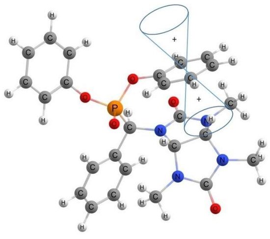 A comparison of the experimental and pre-calculated δ values for the hydrogen atoms bonded to the carbon atom in the phosphonate substituent (CHPO3) and for the bridging CH-CH (3a, 6a) group demonstrates the significant discrepancy in these values for the enantiomeric pairs of the SRR and RSS (4″) types and indicates the values’ precision for the RSR and SRS (4′) pairs. For example, the experimental δ of the carbon proton (CHPO3) and CH-CH protons (3a, 6a) in the compound of group 4a″ equal 5.85, 5.50, and 5.00 ppm, whereas the pre-calculated ones equal 6.57, 5.20, and 2.74 ppm. This discrepancy might be caused by the fact that the most stable pre-calculated conformations of structure 4a″ (SRR and RSS) contain the phenyl rings located relative to the glycoluril fragment, thus creating anisotropy cones and shielding the farthest methine proton in the bridging group (CH-CH). At the same time, the hydrogen atom in the methine group of the phosphonate substituent remains in the de-shielding region (Figure 4). This effect is not observed in the experimental 1H NMR spectra, which might be linked to the impossibility of tracking the solvating effect of the solvent using ab initio methods and to the respective change in the structure conformations in the actual solution. The observed effect of phenyl rings on the SRR- and RSS-type enantiomers is retained for the OH and NO2 derivatives (4b″–4f″).