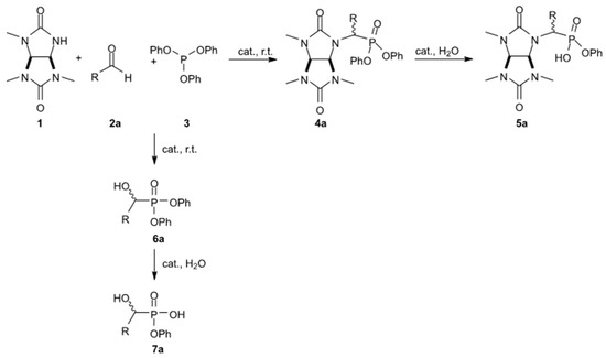 The authors carried out the selection of catalysts, solvents, temperatures, and reaction times to establish the optimal conditions for synthesizing the target product 4a because the typical conditions for the synthesis of α-aminophosphonates proved to be inefficient in obtaining phosphonate derivatives of 1,3,4-trimethylglycoluryl 1.