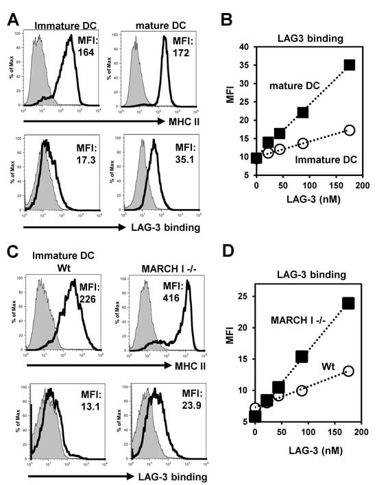 LAG-3 bound to non-ubiquitinated MHC II. (A) Flow cytometric analysis of MHC II expression and LAG-3 binding on CD11c-positive immature or mature DCs. (B) Binding of LAG-3 to immature or mature DCs. X-axis, input LAG-3 (nM); Y-axis, mean channel intensity (MFI). (C) Flow cytometric analysis of MHC II expression and LAG-3 binding on CD11c-positive wt immature DCs or MARCH I -/- immature DCs. (D) Binding of LAG-3 to wt immature DCs or MARCH I -/- immature DCs. Data are representative of three independent experiments.