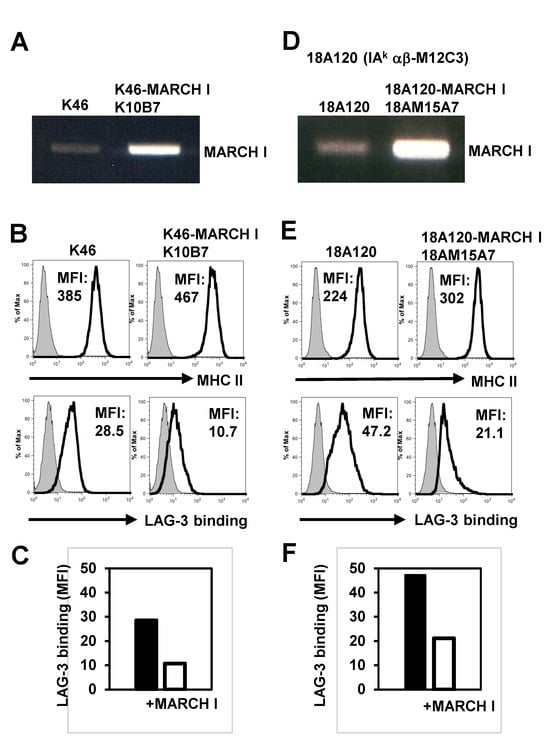 LAG-3 did not efficiently bind to ubiquitinated MHC II. (A) RT-PCR of MARCH I over-expressing K46 and K46, K10B7 (B) Flow cytometric analysis of MHC II expression and LAG-3 binding to K46 or K10B7. (C) Mean channel intensity (MFI) for binding of LAG-3 to K46 and K10B7 (D) RT-PCR of MARCH I against IAkαβ M12C3, 18A120 or MARCH I overexpression 18A120, M15A7. (E) Flow cytometric analysis of MHC II expression and LAG-3 binding to 18A120 and 18AM15A7. (F) MFI of LAG-3 binding to 18A120 and 18AM15A7.