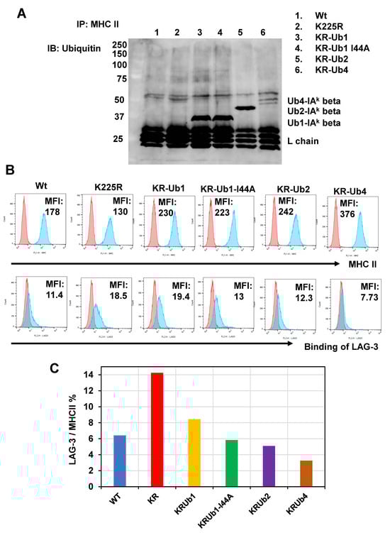 We hypothesized that ubiquitination might influence the shape and robustness of the MHC II molecules. To explore this notion, we adopted a technique from Ira Melman’s group [] to generate a set of ubiquitinated MHC II variants. Specifically, we engineered genetic sequences with ubiquitin irreversibly linked by substituting lysine (K) with arginine (R). Using M12C3 cells, which lack native MHC II expression, we produced stable cell lines containing IAk-wt, IAk-K225R, IAk-KR Ub1, IAk-KR Ub1-I44A, IAk-KR Ub2, and IAk-KR Ub4 (Supplementary Figure S2). Immunoprecipitation with MHC II revealed ubiquitin bands in IAk-KR Ub1, IAk-KR Ub1-I44A, IAk-KR Ub2, and IAk-KR Ub4, as indicated in Figure 3A. Despite similar expression levels of MHC II, the binding of the soluble LAG-3 (sLAG-3) tetramer varied with the number of ubiquitin molecules, showing a decrease, as depicted in Figure 3B. The Mean Fluorescence Intensity (MFI) ratio of LAG-3 tetramer binding to MHC II expression, shown in Figure 3C, indicated that ubiquitin inhibited LAG-3 binding in a ubiquitin number-dependent manner. Therefore, ubiquitination seems to modify the structure and stability of MHC II.