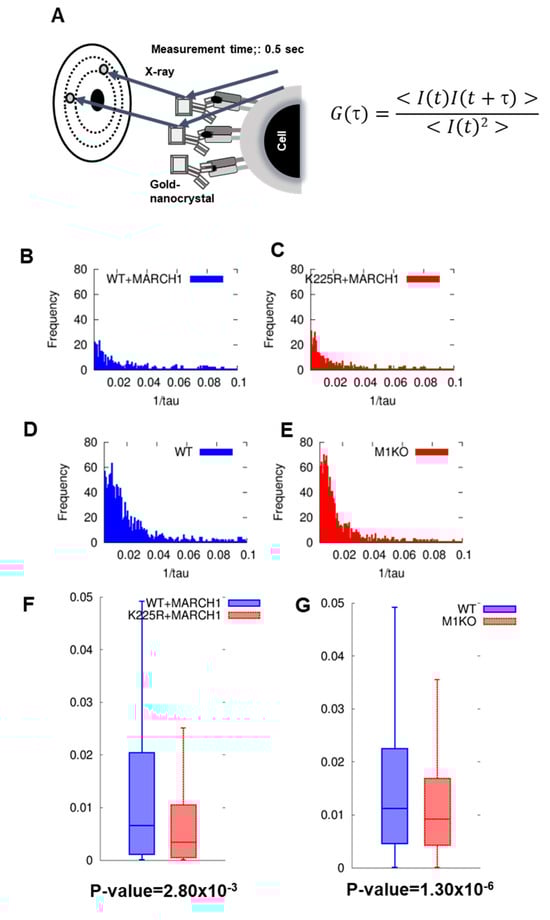 The movement of ubiquitinated MHC II detected on cells by Diffracted X-ray Blinking (DXB) was faster than that of non-ubiquitinated MHC II. (A) Schematic of Diffracted X-ray Blinking (DXB). Gold nanocrystals were bound to MHC II antibodies. After incubation of the nanocrystals and cells, white X-rays were irradiated, and the diffracted blinking spots were videotaped. (B) Attenuation constant distribution of IAkαβ + MARCH I-transfected M12C3. (C) Attenuation constant distribution of IAkαβ K225R + MARCH I-transfected M12C3 (D) Attenuation constant distribution of wt immature DC. (E) Attenuation constant distribution of MARCH I deficient immature DC. (F) Comparison of attenuation constant distributions using box-and-whisker plots of wt + MARCH I (blue) and K225R + MARCH I (red). The median attenuation constant was 6.75 × 10−3 for wt + MARCH I and 3.25 × 10−3 for K225R + MARCH I. (G) Comparison of attenuation constant distributions for wt immature DC (blue) and MARCH I deficient immature DC (red). Median attenuation constants were 11.15 × 10−3 for wt immature DCs and 9.65 × 10−3 for MARCH I deficient immature DCs. p-value = 1.30 × 10−6.