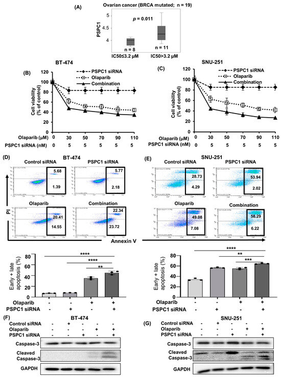 PSPC1 inhibition synergizes with olaparib in BRCA1/2-mutated PSPC1-expressing cells. (A) Correlation between PSPC1 expression and olaparib sensitivity, which was defined as IC50 ≤ 3.2 µM, in BRCA1/2-mutated ovarian cancer cell lines using GDSC data. p-values were analyzed by Student’s t-test. (B,C) MTT assay showed that combined PSPC1 siRNA and olaparib enhanced the antiproliferative effects in (B) BT−474 and (C) SNU−251 cells. Cells were treated with 5 nM of PSPC1 siRNA and indicated concentrations of olaparib and incubated for 72 h. (D,E) Apoptosis assay carried out by flow cytometry after staining with annexin V-APC/PI, representative scatter plots of PI (y-axis) and annexin V (x-axis). The number of total apoptotic cells were increased after the treatment with combined PSPC1 siRNA (5 nM) and olaparib (IC50 concentration in BT−474 and half IC50 concentration in SNU−251) for 72 h in (D) BT−474 and (E) SNU−251 cells. The data shown here were representative of three independent experiments. The bar graphs depicted the average of total apoptotic cells of three independent experiments. p-values were calculated by one-way ANOVA analysis, indicating ** p < 0.01, *** p < 0.001, **** p < 0.0001. Data are presented as mean ± standard deviation from three independent experiments. (F,G) The expressions of apoptosis markers, caspase−3 and cleaved caspase−3 were analyzed with Western blot in (F) BT−474 and (G) SNU−251 cells. Cells were treated for 72 h with PSPC1 siRNA (5 nM), olaparib (IC50 concentration in BT−474 and half IC50 concentration in SNU−251) and their combination. GAPDH was used as a loading control.