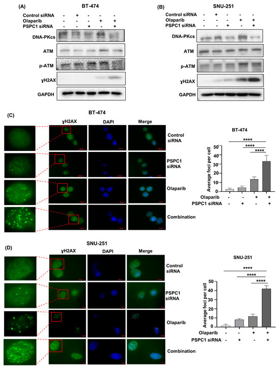 Next, to investigate the mechanisms behind the aforementioned apoptosis, we assessed the expression of DDR-associated genes because olaparib affects DNA damage based on its mechanism of action. We initially analyzed the expression of ɣH2AX as a DNA DSBs marker and observed that olaparib monotherapy increased the expression of ɣH2AX. However, when PSPC1 siRNA was combined with olaparib, a robust expression of ɣH2AX was observed in both BT−474 and SNU−251 cells (Figure 2A,B), suggesting the combination therapy was able to induce more profound DNA DSBs. In addition, the immunocytochemistry staining showed that combination treatment promoted greater formation of ɣH2AX foci than did monotherapy in both cell lines (Figure 2C,D).