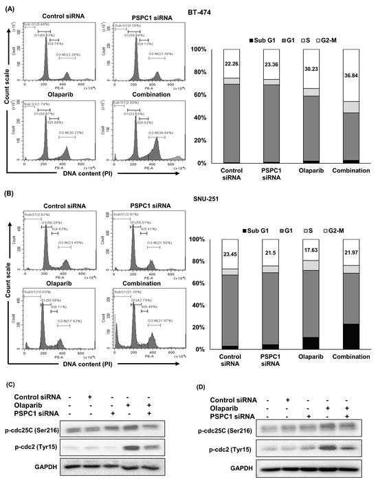 Our observation of an increase in DNA DSBs after combination treatment motivated us to investigate how cell cycle distribution was influenced by olaparib and PSPC1 siRNA treatment. However, our cell cycle analysis in BT−474 cells showed that combination treatment promoted a greater accumulation (36.84%) of G2/M phase cells than did olaparib (30.23%) and PSPC1 siRNA (23.36%) alone. In addition, the sub-G1 population, which is an indicator of apoptotic cell death, was slightly increased (2%) after combination treatment with olaparib and PSPC1 siRNA, compared to olaparib alone (1.74%) (Figure 3A). Cell cycle analysis in SNU−251 cells also showed results similar to those for BT−474 cells. The data showed that 17.63% of the cells were accumulated in the G2/M phase after olaparib treatment, which increased to 21.97% when olaparib was combined with PSPC1 siRNA. Similarly, combination therapy promoted greater accumulation of cells in the sub-G1 phase (21.30%) than did olaparib (10.03%) and PSPC1 siRNA (3.91%) alone, indicating that adding olaparib to PSPC1 siRNA enhanced apoptotic cell death (Figure 3B). To further evaluate the molecular mechanism by which PSPC1 inhibition-induced ATM suppression regulated the cell cycle, we investigated the cell cycle transition-regulatory proteins, cell division cycle 25C (cdc25C) and cdc2, also known as cyclin dependent kinase 1 (CDK1) [36], using Western blotting. ATM is known to play key roles in checkpoint activation via Chk1/checkpoint kinase 2 (Chk2) upon DNA DSBs [37]. Specifically, phospho-Chk1 (activated by p-ATM) has been reported to inactivate cdc25C by phosphorylation on serine-216, which prevents dephosphorylation of cdc2, resulting in the suppression of CDK1/cyclin B complex, thereby inducing G2/M checkpoint activation [38]. We observed that the expressions of phospho-cdc25C [p-cdc25C (Ser216)] and phospho-cdc2 [p-cdc2 (Tyr15)] were increased after olaparib treatment, suggesting that the G2/M checkpoint was activated. However, combining PSPC1 siRNA with olaparib decreased the expressions of those two proteins again, indicating that the G2/M transition occurred due to the p-ATM suppression (by PSPC1 siRNA)-induced activation of cdc25C (Figure 3C,D).