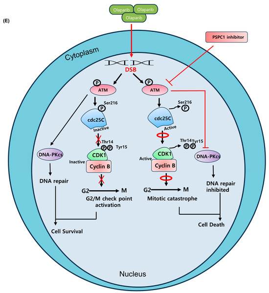 Mitotic catastrophe caused by combination treatment could explain the synergistic mechanisms. (A,B) BT−474 and SNU−251 cells were treated with 5 nM of PSPC1 siRNA, olaparib (IC50 concentration in BT−474 and half IC50 concentration in SNU−251), and their combination for 72 h. Cell cycle distribution was assessed by flow cytometry after staining with PI. The histogram exhibited the distribution of cells in various phases (G0/G1, S, and G2/M) and the bar graphs represented the percentage of cells in G0/G1, S, and G2/M phases of cell cycle. (C,D) Western blot was carried out to check the expression of cell cycle progression-related proteins such as p-cdc25C and p-cdc2. (C) BT−474 and (D) SNU−251 cells were treated with 5 nM of PSPC1 siRNA, olaparib (IC50 concentration in BT-474 and half IC50 concentration in SNU−251), and their combination for 72 h. GAPDH was used as a loading control. (E) Graphical view of the proposed mechanism. Olaparib induced inhibitory phosphorylation of CDK1 causes mitotic exit which is reversed by PSPC1 inhibition (due to PSPC1 inhibition induced ATM and DNA-PKcs suppression), eventually premature mitotic entry occurred of the DNA-damaged cells, leading to mitotic catastrophe.