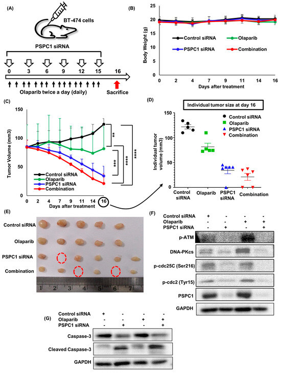 We subsequently evaluated the in vivo efficacy of olaparib, PSPC1 siRNA, and their combination in a BT−474 xenograft mouse model. The schedule of the animal experiments is depicted in Figure 4A. First of all, PSPC1 siRNA or the combination used in this study were well tolerated, and no generalized toxicity was observed given that the body weight remained normal (Figure 4B). Combining PSPC1 siRNA with olaparib promoted greater tumor regression than did PSPC1 siRNA alone (p = 0.211), olaparib alone (p < 0.0001), and control siRNA (p < 0.0001) (Figure 4C). The individual tumor volumes were shown in Figure 4D. Remarkably, combination treatment exhibited complete tumor regression in two out of the six mice (Figure 4E). PSPC1 siRNA alone also significantly inhibited the tumor growth, including complete tumor regression in one mouse, compared to control siRNA (p < 0.0001). Finally, the mice were sacrificed on day 16, and the tumors were excised for further experiments. After subjecting tumor tissue lysates to Western blot analysis, we observed a similar pattern of expression in the genes tested in vitro. Briefly, combination therapy markedly reduced the expression of DDR-related genes, such as p-ATM and DNA-PKcs. In addition, combination therapy promoted greater inhibition of the expression of cell cycle-related genes, p-cdc25C (Ser216) and p-cdc2 (Tyr15), than did monotherapy, indicating that the G2/M transition occurred (Figure 4F). Lastly, the expression of cleaved caspase-3 was noticeably elevated, suggesting increased apoptosis (Figure 4G).