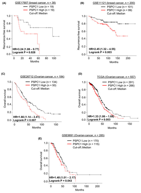To determine whether PSPC1 mRNA expression levels were associated with prognosis in patients with breast and ovarian cancer, we analyzed two independent public mRNA expression data sets of curatively resected breast cancer (GSE17907 and GSE11121) and three independent public mRNA expression data sets of primary debulked ovarian cancer (GSE26712, TCGA, and GSE9891) using the online platform Kaplan–Meier plotter [50]: https://kmplot.com/analysis/ (accessed on 01 August 2023). Affymetrix Genechip Human Genome U133 Arrays were used for all these data sets. Affymetrix ID 218371 was selected for PSPC1. PSPC1 mRNA expression levels were divided into two groups, “PSPC1-High” and “PSPC1-Low” with the median as the cutoff. Recurrence-free survival (RFS) or overall survival (OS) were analyzed based on PSPC1 mRNA expression level.