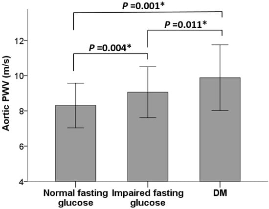 Mean aortic PWV values (±1 SD) among normal fasting glucose, impaired fasting glucose, and DM patients. * p < 0.05 was considered to be statistically significant.