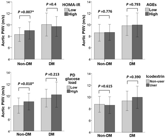 Figure 2 illustrates the associations of glucometabolic indices with aortic PWV among non-DM and DM patients. In non-DM patients, individuals in the high HOMA-IR group and high PD glucose load group had significantly higher aortic PWV compared to those in the low HOMA-IR and PD glucose load groups (p = 0.007 and 0.010, respectively). No significant differences were observed regarding the high and low serum AGE groups, as well as regarding the use of icodextrin (p = 0.776 and 0.615). However, in DM patients, none of the glucometabolic factors mentioned above could be linked to distinct differences in aortic PWV.