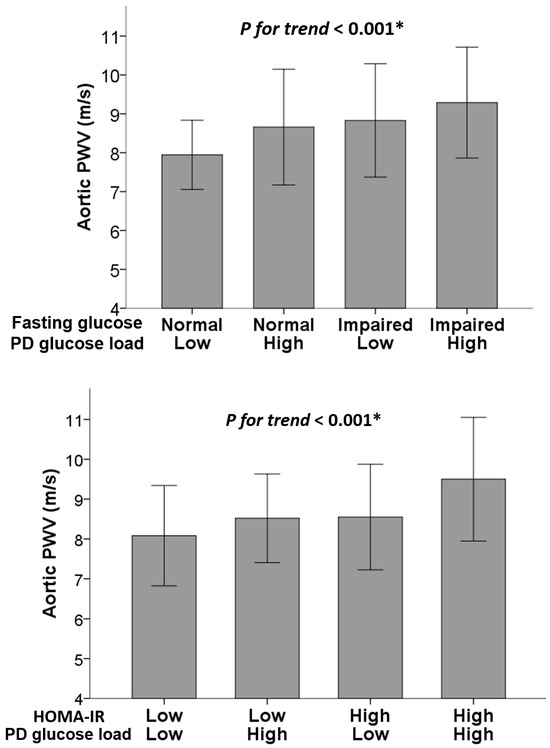 Subsequently, Figure 3 further provides the aortic PWV values stratified by PD glucose load, fasting glucose status, and HOMA-IR levels among non-DM patients. Patients with impaired fasting glucose and a high PD glucose load exhibited the highest aortic PWV values (p for trend < 0.001), as did those with both high HOMA-IR and PD glucose loads (p for trend < 0.001). These trends and independent associations are confirmed in Table 4.