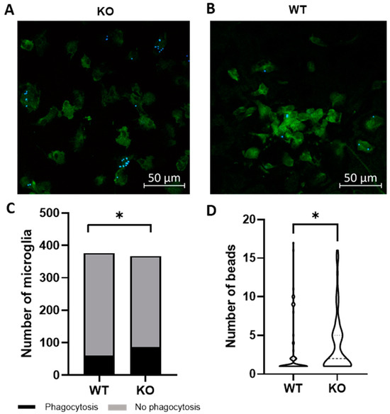 Microglia are hypothesized to facilitate repair following demyelination in MS via phagocytosis of myelin debris [12]. To determine if Trpv4 deletion alters microglial phagocytosis, we performed an in vitro phagocytosis assay on microglia isolated from global Trpv4 knockout (KO), or Trpv4KO, mice. Loss of TRPV4 led to a 7.3% increase in the percentage of microglia performing phagocytosis (23.50% of Trpv4KO microglia performed phagocytosis and 16.18% of wild-type (WT) microglia performed phagocytosis (95% CI, 0.15–13.04%), p < 0.05). Trpv4KO microglia that engaged in detectable phagocytosis also contained a greater number of beads per cell compared to WT microglia (3.60 per microglia in KO microglia (95% CI, 2.88–4.50) vs. 3.00 per microglia in WT microglia (95% CI, 2.04–3.95), p < 0.05) (Figure 1).