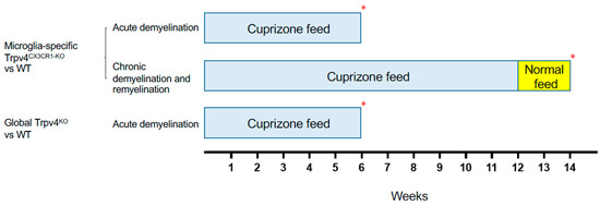Cuprizone is a copper-chelating mitochondrial toxin that causes oligodendroglial cell death and demyelination by an inhibition of complex IV of the mitochondrial respiratory chain and induces megamitochondria in the mouse brain. To induce acute demyelination in the CNS, global TRPV4KO and microglia-specific Trpv4CX3CR1-KO mice, standard 0.3% cuprizone diet in chow (Sigma; St. Louis, MO, USA) was provided for a period of six weeks as previously described [35]. Another group of microglia-specific Trpv4CX3CR1-KO mice were fed a standard 0.3% cuprizone diet in chow (Sigma; St. Louis, MO, USA) for 12 weeks followed by two weeks of regular feed (Gateway lab supply, St Louis, MO, USA) to model chronic demyelination and subsequent remyelination as previously described [36]. The body weight of all mice was monitored once a week. For biological replication, the global TRPV4KO cohort that underwent acute demyelination contained 8 mice and the wild type cohort contained 8 mice. For the microglia-specific Trpv4CX3CR1-KO mice, the knockout cohort that underwent acute demyelination contained 8 mice and the wild type cohort contained 8 mice, and the knockout cohort that underwent chronic demyelination and remyelination contained 15 mice and the wild type cohort contained 8 mice.