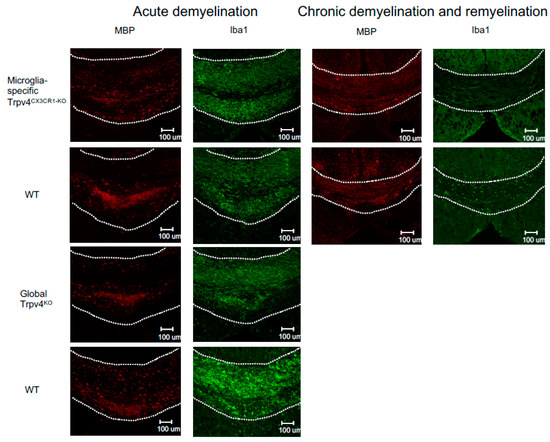 Representative immunofluorescent images of the splenium of the corpus callosum from microglia-specific Trpv4CX3CR1-KO and global Trpv4KO mice treated with cuprizone. Mice in each group were treated with either 6 weeks of cuprizone (acute demyelination protocol) or 12 weeks of cuprizone and 2 weeks of regular feed (chronic demyelination and remyelination protocol). All images were taken from the same reference point in the splenium of the corpus callosum. MBP staining (first and third column) visualizes myelin (in red). Iba1 staining (second and fourth column) visualizes microglia density (in green). The dotted white line demarcates the borders of the splenium of the corpus callosum. Scale bars indicate 100 µm. WT = wild type.