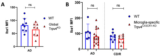 All animal experiments followed the guidelines of the National Institutes of Health (NIH, New York, NY, USA), and all animal protocols were approved by the Institutional Animal Care and Use Committees (IACUC) of Washington University in St. Louis. Mice were housed in a temperature- and humidity-controlled animal facility employing a 12 h light/dark cycle with food and water available ad libitum. Global Trpv4KO mice [32] and Trpv4f/f; CX3CR1CreERT2 mice (microglia-specific Trpv4CX3CR1-KO mice) were bred in-house (HH lab) [21,33]. Microglia-specific Trpv4CX3CR1-KO mice were treated with 100 mg/kg of tamoxifen administered via oral gavage for 5 consecutive days to induce Cre-Lox recombination. Genotypes were determined by PCR from the DNA extracted from tail tips. Trvp4 flox alleles were genotyped by the primer set (5′-CCAAGACAGGCAAGATCGGG-3′; 5′-CTGACTGATGGAGGTTGGGT-3′). Genotyping CX3CR1CreERT2 mice utilized the following primers: 5′-CCAAGACAGGCAAGATCGGG-3′; 5′-CTGACTGATGGAGGTTGGGT-3′. The recombined Trpv4 allele in microglia-specific Trpv4CX3CR1-KO mice following tamoxifen administration was genotyped using primers (5′-ACCCTCATTTTGGTCCATCC-3′; 5′-CTGACTGATGGAGGTTGGGT-3′). Microglia were isolated from microglia-specific Trpv4CX3CR1-KO mice via FACS sorting and genotyped to confirm successful recombination (Supplementary Figure S2). Both females and males were used in this study. WT litter mates served as controls for all animal experiments.