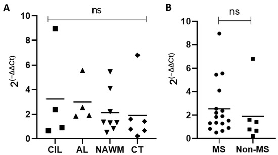 Fresh frozen tissue blocks were obtained from the John L. Trotter MS tissue biorepository at Washington University from the brain tissue of MS patients (demographics listed in Table 1). MS lesions and healthy control tissue were obtained from periventricular cerebral white matter. RNA from tissue sections was extracted with the RNAeasy kit (QIAGEN; Germantown, MD, USA) according to the manufacturer’s instructions. cDNA was created using SuperScript IV Reverse Transcriptase according to the manufacturer’s instructions. Quantitative real-time PCR was carried out using TaqMan Fast Advanced Master Mix (ThermoFisher; Waltham, MA, USA) on an ABI 7900HT instrument. GAPDH was used as the normalization control and the DDCT method was used to quantify gene expression.